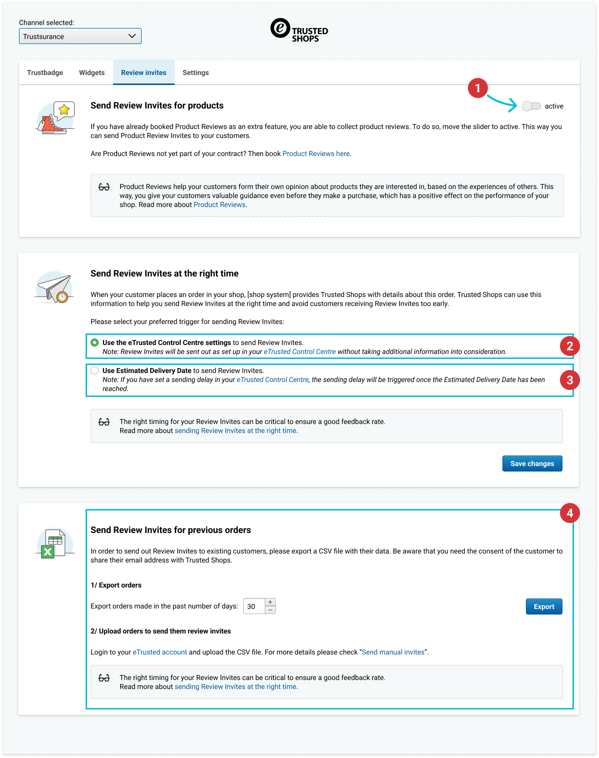 By default, Review Invites are sent out using an optimal timing based on Trusted Shops’ data. You can however change this in the Control Centre.